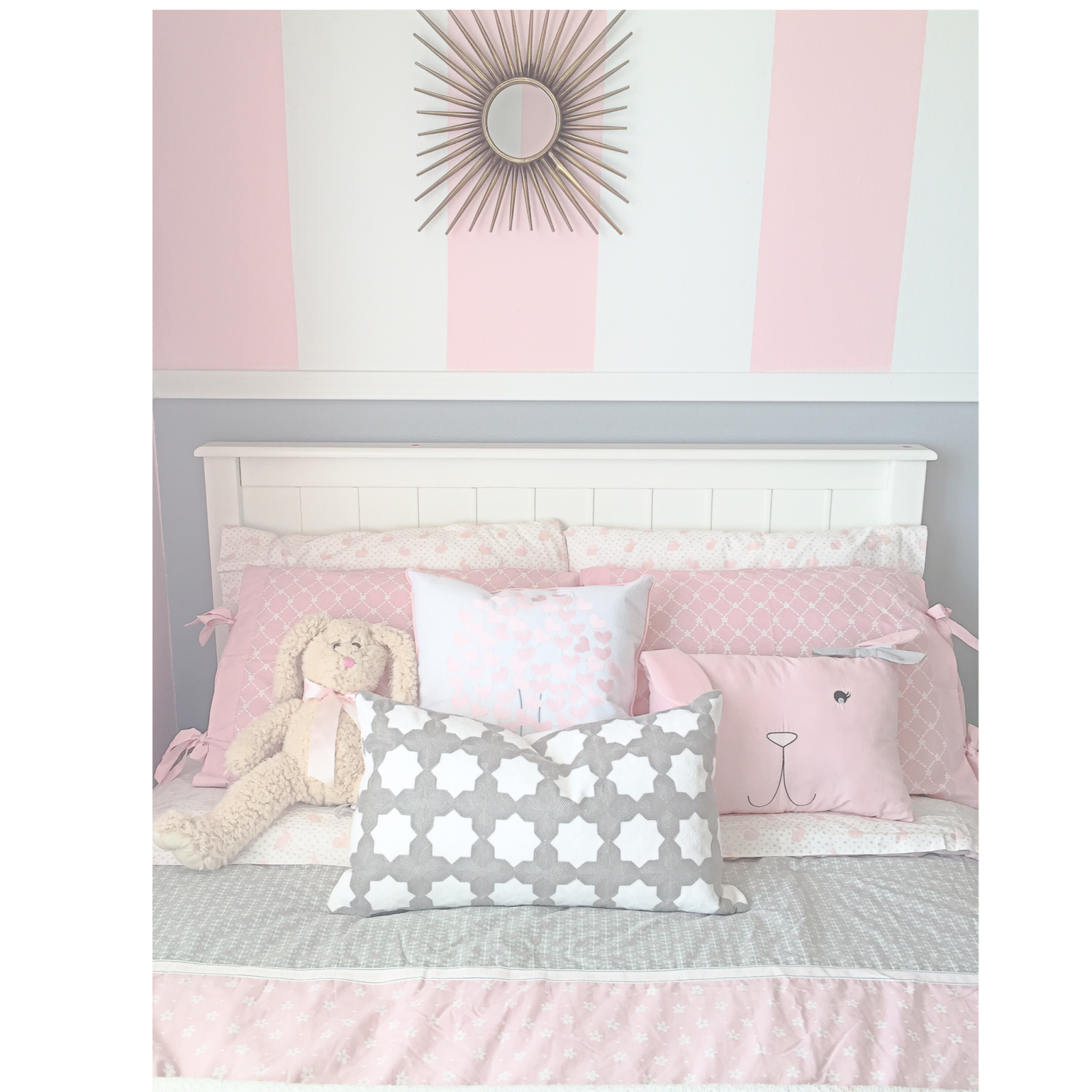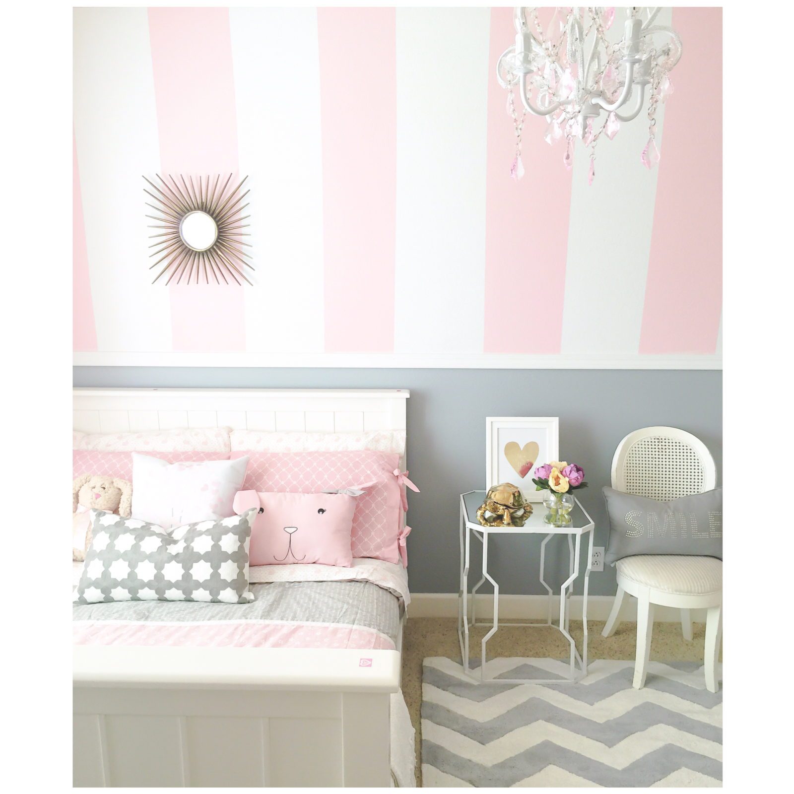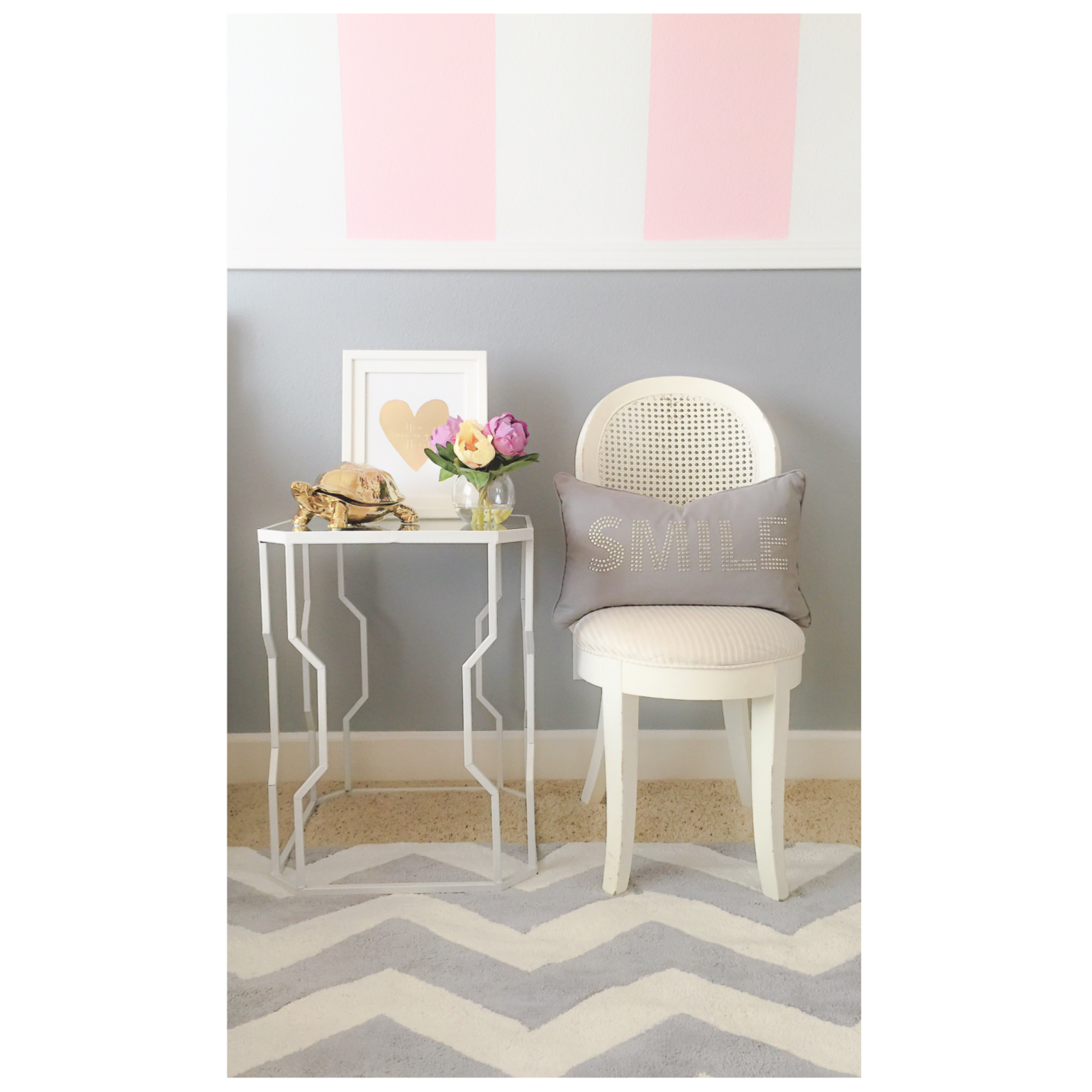 - Grey {smile} pillow, grey & white pattern pillow, geometrical mirrored side table, gold mirror over the headboard, faux bouquet, cute bunny & wall prints; all from Home Goods